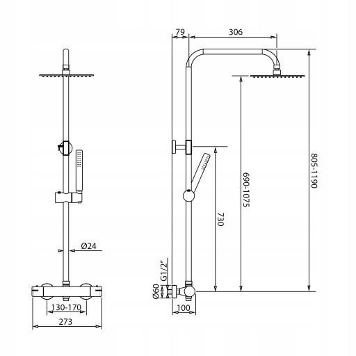 Na zestaw składają się: drążek prysznicowy z deszczownicą, słuchawka prysznicowa z wężykiem oraz bateria z termostatem.