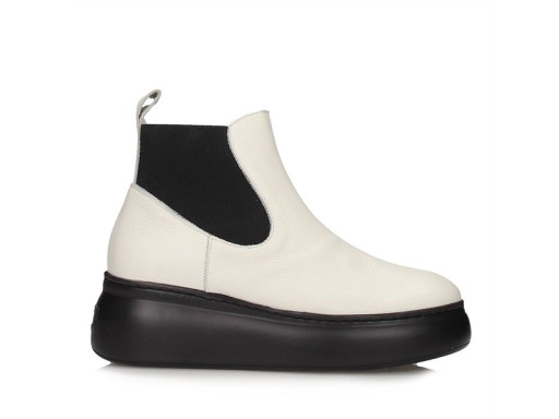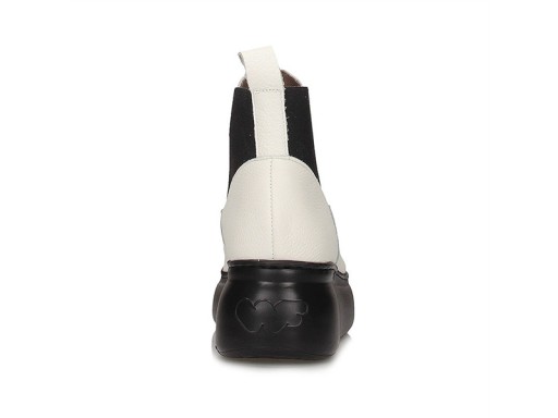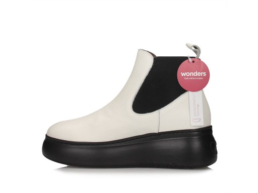 Komfortowe, proste w formie, a jednak podsycone kontrastem bieli i czerni botki produkcji hiszpańskiej marki Wonders. Model osadzony na wygodnej platformie, cholewka ze skóry naturalnej posiada wstawkę z gumy umożliwiającą dopasowanie, środek skóra naturalna. Prezentowane botki marki Wonders to idealny wybór dla kobiet ceniących nie tylko wygodę, ale także styl. Wykonane z wysokiej jakości skóry naturalnej, te damskie botki zapewniają trwałość i wygodę przez długi czas. Białe botki na platformie Wonders to połączenie prostoty, elegancji i trwałości. Pasują idealnie zarówno do codziennych, jak i bardziej eleganckich stylizacji.