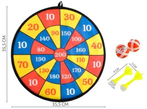 Żywe kolory tarczy zachęcają dziecko do zabawy, ale również ułatwiają celowanie w wybrane punkty. Żywe kolory sekcji punktacyjnych dodają wizualnego uroku i nadają grze energii. Każdy rzut to kolorowa eksplozja radości! Dodatkowo mocne rzepy to gwarancja trwałego przyczepiania się do tarczy, co sprawia, że rzuty stają się precyzyjne i pełne adrenaliny. Mocne rzepy to również pewność, że gra potrwa przez wiele rund. Nie trzeba rzucić w tarczę z dużą siłą, żeby piłeczka czy lotka została w odpowiednim polu.