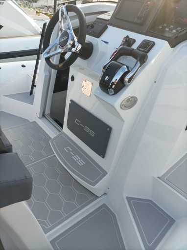 C35 to idealna łódź dla tych, którzy chcą przeżyć wakacje na świeżym powietrzu, cumując w porcie lub na kotwicy, mając pełną autonomię dzięki aneksowi kuchennemu z dwoma palnikami i zlewem za fotelem kierowcy oraz oddzielnej toalecie.