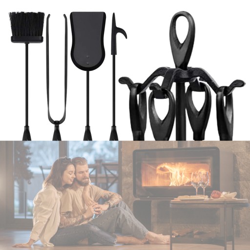 Obejmuje miotłę, szufelkę, pogrzebacza, szczypce i stojak. Każde narzędzie jest wyposażone w wyznaczone miejsce na stojaku, co sprzyja utrzymaniu porządku obok kominka.