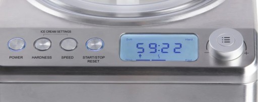 Panel sterowania znajduje się na górze urządzenia. Użyj podświetlanych przycisków i pokrętła, aby dostosować ustawienia lodziarni i wybrać jeden z 3 programów - lody, mieszanie lub chłodzenie. Wyświetlacz LCD pokazuje wszystkie wybrane parametry, takie jak pozostały czas, wybrany program, graficzną reprezentację ustawionej prędkości mieszania i graficzną reprezentację aktualnej sztywności lodów.