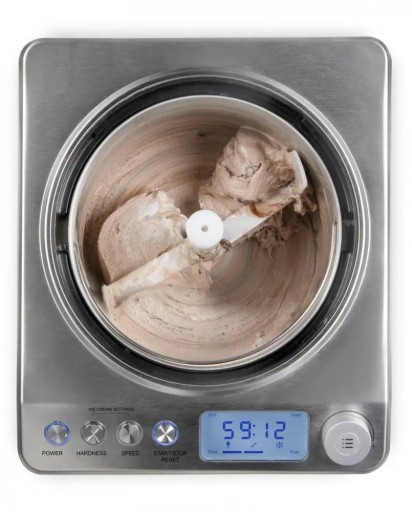 Zanim przystąpisz do produkcji lodów, nie musisz wkładać pojemnika do zamrażarki. Producent jest w pełni automatyczny. Dzięki wbudowanej sprężarce zaraz po rozpakowaniu urządzenia zaczniesz przygotowywać lody śmietankowe, lody, sorbety owocowe i mrożone jogurty. Silnik DC z bezpośrednim napędem bez paska zapewnia, że praca lodziarni jest cicha i wydajna. Jeśli urządzenie zostanie przeciążenie, zabezpieczenie silnika automatycznie go wyłączy. Po zakończeniu procesu produkcji maszyna do lodów jeszcze przez kolejne 2 godziny utrzymuje zawartość pojemnika w chłodzie.