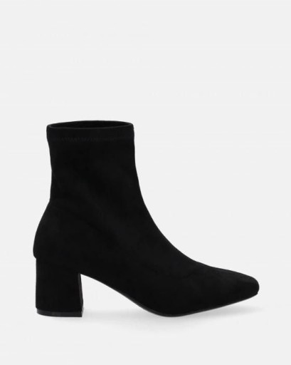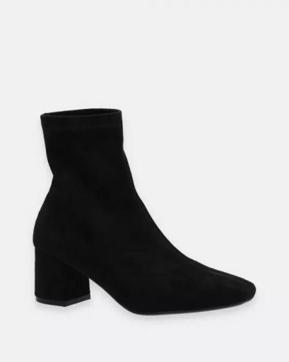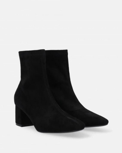 Klasyczne czarne botki wykonane z wysokiej jakości materiału syntetycznego imitującego zamsz. Krótka cholewka z suwakiem świetnie sprawdzi się zarówno w codziennych, jak i formalnych stylizacjach.