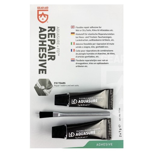 AQUASURE to najbardziej popularny klej używany do klejenia sprzętu turystyczno-wodnego. Sklei skafandry neoprenowe i inne elementy uszkodzonego sprzętu. Wodoodporny. W sprzedaży dwie tubki po 7 g kleju w celu uniknięcia szybkiego wyschnięcia.