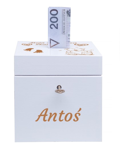 - Drewnianą skarbonkę w białym kolorze wyposażoną w ozdobny kluczyk,