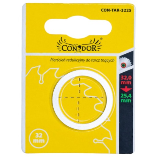 Pierścień redukcyjny do tarcz tnących. Zastosowanie pierścieni pozwala na zredukowanie otworu wewnętrznego ( montażowego ) z 32 mm do średnicy 25,4 mm. Niezbędne w przypadku stosowania jednego rodzaju tarczy w wielu różnych urządzeniach gdzie występują różne otwory montażowe.