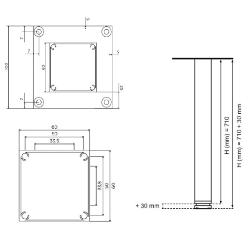 Nogi skonstruowane są na bazie profili aluminiowych o przekroju 60x60 mm. Z jednej strony zakończone solidną płytką montażową, zaś z drugiej regulatorem wykonanym z wysokiej jakości tworzywa sztucznego nierysującego podłogi. Nośność nogi wynosi 100 kg/szt.