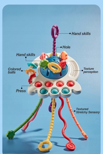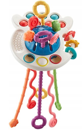 Może pełnić rolę zarówno gryzaka, jak i narzędzia do rozwijania małych rączek. Zawiera wiele przycisków do naciskania, strun z różnymi końcówkami i różnym poziomem trudności w ich wyciąganiu, co zapewnia długotrwałą zabawę.
