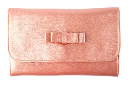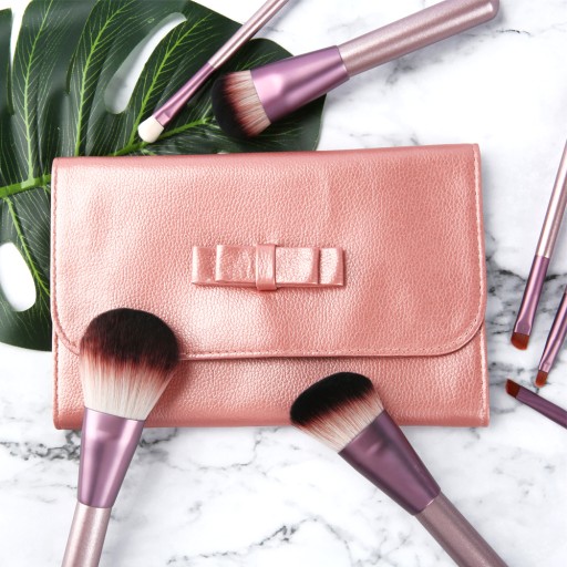 Eleganckie etui na pędzle oraz przybory do makijażu, w kolorze metalicznym łososiowym, zwieńczone uroczą kokardą.