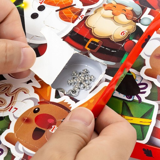 Świąteczny kalendarz bransoletkowy: Otrzymasz świąteczny kalendarz adwentowy, istnieje wiele wykwintnych i uroczych bransoletek z różnymi kolorami i motywami zawieszek, aby świętować odliczanie świąteczne, takie jak choinka, czapka Mikołaja, dzwonki, pończochy, Święty Mikołaj, laska cukierków, płatek śniegu itp.