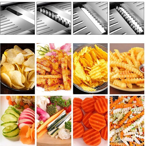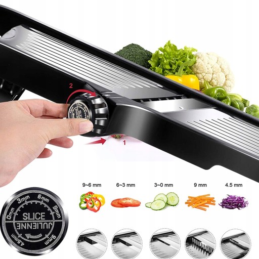 Ta niesamowita krajalnica do warzyw ma ostre ostrza ze stali nierdzewnej, które zapewniają czyste, czyste cięcie każdego rodzaju żywności. Oferuje 2 opcje krojenia, plasterki lub julienne, dzięki czemu możesz kroić tak, jak chcesz, odpowiednie dla każdego rodzaju warzyw, owoców lub frytek. Za pomocą naszej krajalnicy możesz dostosować grubość od bardzo cienkiej do 9 mm, aby uzyskać idealną sałatkę.