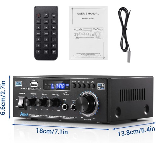 Wzmacniacz audio Bluetooth kompatybilny z dwoma głośnikami pasywnymi 4-16 Ω. Wzmacniacz mocy z pilotem do zdalnych ustawień audio, odczytuje karty SD i odtwarzacz MP3 USB, obsługuje połączenie bezprzewodowe BT, z wtyczką amerykańską dla łatwej obsługi, idealny do systemu kina domowego.