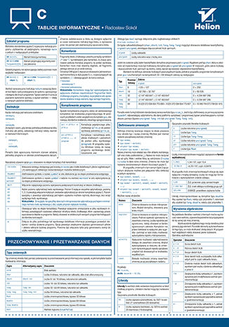 Tablice informatyczne języka C to ściąga, którą każdy programista powinien mieć zawsze w zasięgu ręki. W końcu trudno zapamiętać wszystkie komendy i metody przeprowadzania operacji, zwłaszcza jeśli nie używa się ich na co dzień. Tutaj znajdziesz informacje o instrukcjach, komentarzach, kompilowaniu programu, a także przechowywaniu i przetwarzaniu danych. Przypomnisz sobie, jak wprowadzać dane i uzyskiwać dane wyjściowe, do czego służą konkretne wyrażenia warunkowe, instrukcje pętli i skoku oraz jak w jaki sposób dynamicznie zarządzać pamięcią. Sprawdzisz, jak przetwarzać tekst, diagnozować przebieg programu, wykorzystywać strumienie i pliki, operować datą i czasem, posługiwać się biblioteką matematyczną. Nie możesz tego przegapić!