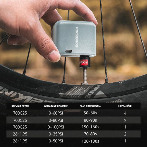 Mini pompka elektryczna marki ROCKBROS została zaprojektowana specjalnie do rowerów, świetnie sprawdza się w awaryjnych sytuacjach na trasie. Bez problemu napompujesz tym mini kompresorem oponę szosową lub oponę MTB.