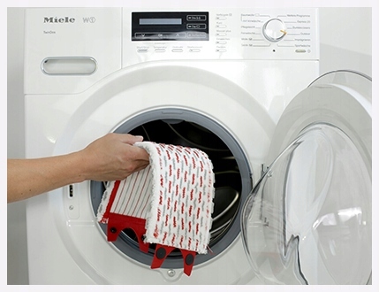 Wkład mopa mocowany jest za pomocą klipsów, dzięki temu łatwo go zdjąć i założyć ponownie. Wkład może być wielokrotnie prany w pralce automatycznej w temperaturze max 60 stopni.