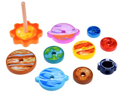 Edukacyjna, drewniana piramidka to idealna zabawka do rozwijania zdolności manualnych dziecka. Zadaniem malucha jest ułożenie krążków na podstawie - od największego do najmniejszego. Zakończeniem piramidy jest element w kształcie hełmu kosmonauty. Całość zachowana jest w kosmicznej stylistyce, krążki to planety Układu Słonecznego, a podstawa to Słońce.