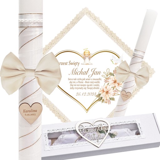 Nasza świeca do chrztu to nie tylko źródło światła, ale również piękna dekoracja. Owinięta jest w białą szyfonową wstążką oraz atłasową białą wstążką z złotą nitką, a na niej znajduje się piękna kokarda. Na świecy umieszczone jest również serduszko z imieniem dziecka oraz opcjonalnie datą chrztu.