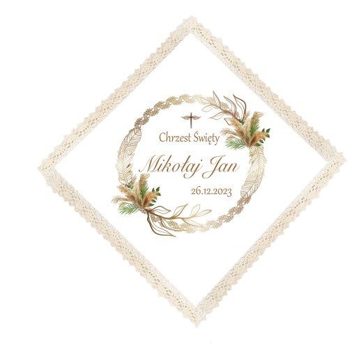 Szatka do chrztu to wyjątkowy produkt, który będzie idealnym prezentem od matki chrzestnej dla dziecka. Szatka ma kształt rombu i wykonana jest z pięknego, śnieżnobiałego materiału, który wspaniale prezentuje się na tle beżowej koronki. Całość tworzy elegancką kompozycję, która będzie stanowić doskonały dodatek.