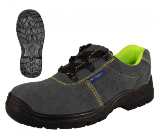 cholewka niska wykonana ze skór naturalnych welurowych, metalowy podnosek, podeszwa dwuwarstwowa pu/pu o zróżnicowanej gęstości, montaż przez bezpośredni wtrysk, odporna na olej, benzynę i inne rozpuszczalniki organiczne, chroniaca przed poślizgiem, absorber energii w pięcie.