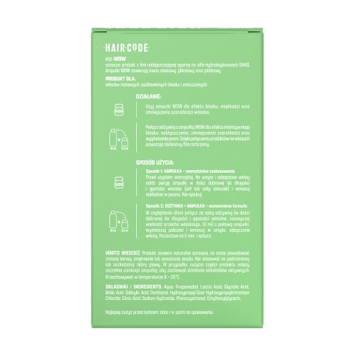 Kwasty AHA - Ampułki WOW zawierają kwas mlekowy, glikolowy oraz jabłkowy przez co przywracają blask włosom, nadają im miękkość oraz zmniejszają szorstkość