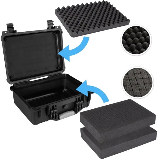 - 3 wyjmowane wkłady piankowe (pianka z wypustkami pod pokrywą, pianka pocięta na sześciany, cienka pianka na dnie)