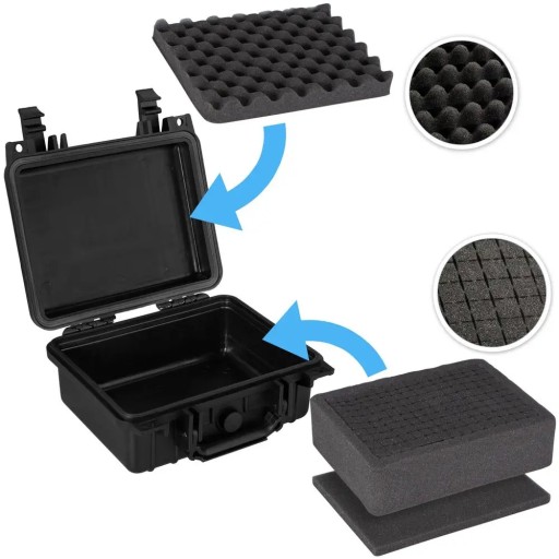 - 3 wyjmowane wkłady piankowe (pianka z wypustkami pod pokrywą, pianka pocięta na sześciany, cienka pianka na dnie)