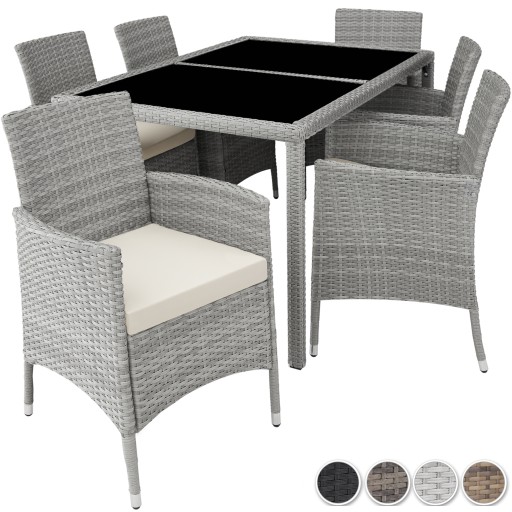 Prezentowany komplet mebli technorattanowych ma wszechstronne zastosowanie i stanowi prawdziwą ozdobę ogrodu, tarasu, ogrodu zimowego lub salonu. Wygodne krzesła i elegancki stół zachęcają do spędzania czasu w gronie rodziny lub przyjaciół. Polirattanowy zestaw zachwyca nie tylko eleganckim wyglądem, lecz również długim okresem użytkowania. Powierzchnia stołu z 2 elementami z ciemnego szkła prezentuje się szykownie i jest łatwa do utrzymania w czystości. Bardzo wygodne poduszki z poliestru doskonale współgrają kolorystycznie z rattanowymi meblami, a pokrowce mają z tyłu zamek błyskawiczny, dzięki czemu można je z łatwością zdjąć i wyczyścić. Zaimpregnowana powierzchnia chroni poduszki przed przemoknięciem. Dzięki impregnacji są one odporne na zabrudzenia i działanie wilgoci. Zestaw obejmuje również osłonę przeciwdeszczową.