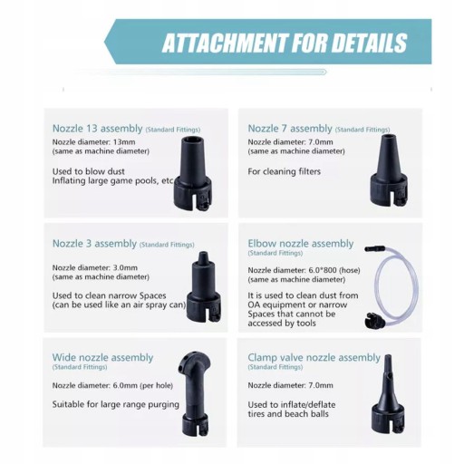 5. SZEROKIE ZASTOSOWANIE: Wyposażone w 7 sztuk różnych dysz i 2 sztuki węży powietrznych, aby spełnić różne potrzeby robocze, szeroko stosowane do czyszczenia warsztatów, pompowania zabawek basenowych itp.