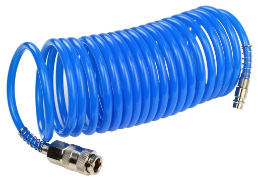 Spiralny wąż pneumatyczny o długości 5m w kolorze niebieskim lub pomarańczowym (kolor wysyłamy losowo). Niezbędny do pracy z każdym kompresorem. Dzięki wyposażeniu w szybkozłączki można podłączyć do niego każde urządzenie pneumatyczne.