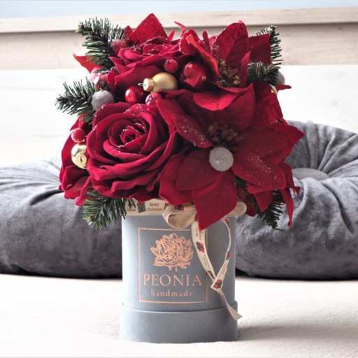 - Świąteczny Flower box (stroik bożonarodzeniowy) został wykonany z wysokiej jakości sztucznych róż oraz poinsecji (gwiazd betlejemskich) z przyjemnego w dotyku aksamitu (weluru) w pięknym kolorze czerwieni. Niesamowicie emitują kwiaty żywe!