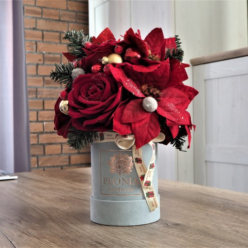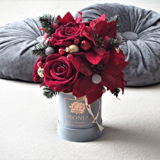 Oferowanym przez nas produktem jest piękny stroik bożonarodzeniowy, tzw. FLOWER BOX ze sztucznych AKSAMITNYCH (welurowych) róż i poinsecji oraz dodatków świątecznych wysokiej jakości!