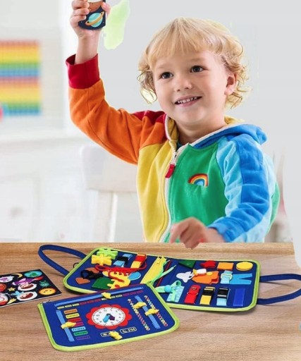 Zapewnia dzieciom 25 aktywności Montessori, w tym zamki błyskawiczne, sznurówki, guziki, klamry pasków, puzzle, alfabet, zegar i gry edukacyjne z kalendarzem.