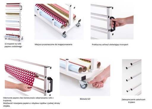 Nasze stojaki na papier do pakowania prezentów to doskonały sposób na organizację i prezentację papieru do pakowania w Twoim sklepie. Z 15 ramionami, miejscem na zapasowe rolki i wygodną rączką, są one nie tylko funkcjonalne, ale również piękne pod względem designu. Możesz je obsługiwać jedną ręką, a kółka z opcją blokady pozwalają na łatwe przemieszczanie stojaka. Dostępne w różnorodnych kolorach, aby pasowały do Twojego stylu!