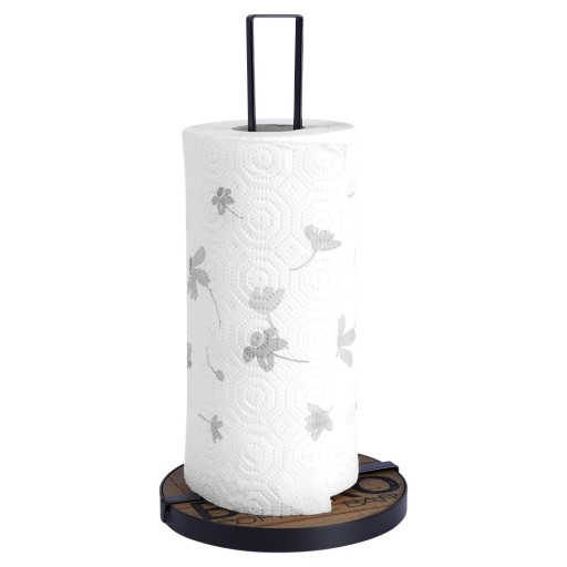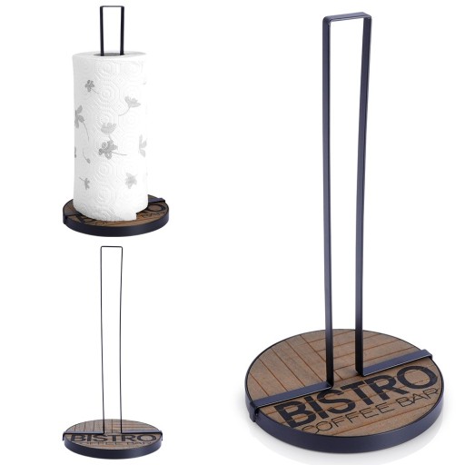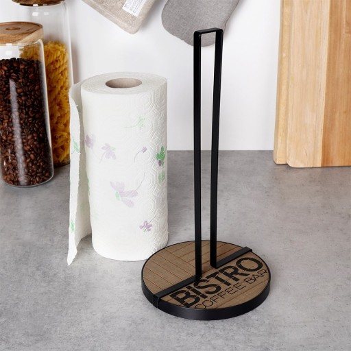 Stojak kuchenny na ręczniki papierowe, ułatwia codzienne czynności i utrzymanie porządku w kuchni. Solidnie wykonany z wytrzymałych materiałów. Stojak utrzymany w modnym połączeniu czerni z drewnem, więc efektownie prezentuje się w każdym wnętrzu. Pozwoli nam na wygodne korzystanie i przechowywanie ręczników. Przydatny w każdej kuchni. Zapewnia łatwe i wygodne odrywanie arkuszy ręcznika, dzięki czemu można szybko i sprawnie wyczyścić powierzchnie lub ręce, bez konieczności szukania i rozwijania całej rolki. Wyprodukowano zgodnie z europejskimi standardami.