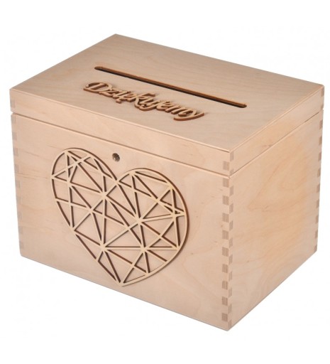 Skrzynka świetnie prezentuje się pomalowana na biało. W swoim asortymencie posiadamy również wiele drewnianych napisów ''Dziękujemy”, ''W dniu ślubu” oraz dekory i serca. W ten sposób spersonalizowanie skrzynki jest dziecinnie proste,mając gotowe elementy dekoracyjne. Pojemnik do przechowywania kopert z pieniędzmi posiada otwór, przez który bez problemu wejdą nawet te grubsze koperty weselne. Naklejone na skarbonie serce geometryczne nadaje jej niepowtarzalnego charakteru. Napis „Dziękujemy” już na wstępie podkreśla co, chcecie wyrazić.Wymiary zew:29x20x21,5cmWymiary wew:27x18,5x20,5cmotwór szer.na cm