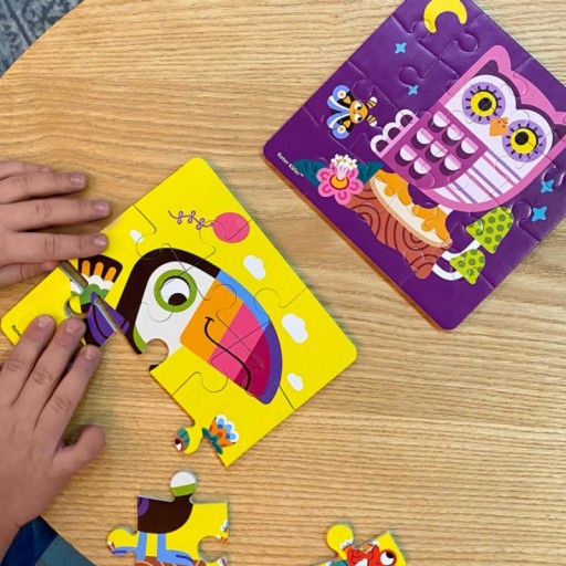Po ułożeniu obrazka dziecko otrzyma barwny obrazek z wizerunkiem zabawnych zwierząt- sowy i tukana.