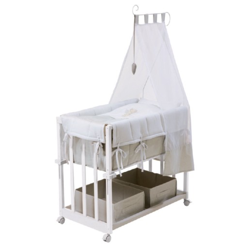 Praktyczne łóżeczko, które świetne sprawdzi się w pierwszych miesiącach po narodzinach dziecka. Może służyć jako łóżeczko dostawne. Możliwość użycia jako ławeczki dla dziecka starszego. W zestawie kółka z hamulcem. Możłiwość ściągnięcia kółek. Miejsce na akcesoria dziecięce. Powierzchnia leżenia wynosi 85 x 43 cm, możliwość bezstopniowej regulacji wysokości leżenia. W zestawie również komplet pościeli do łóżeczka.