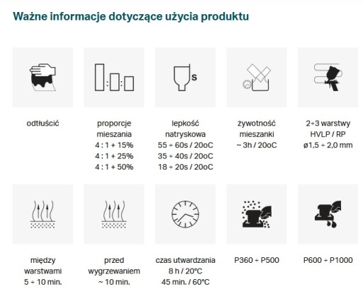 W zależności od ilości dodawanego rozcieńczalnika może być stosowany jako podkład wypełniający (4+1+15%) lub przegrodowy (4+1+25%), a przy dużym rozcieńczeniu również aplikowany techniką “mokro na mokro” (4+1+50%).