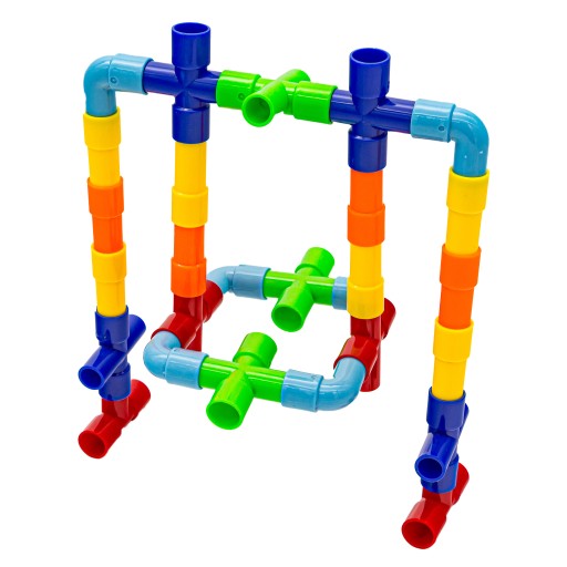 - Zestaw składa się z wielu kolorowych, plastikowych kolanek oraz pozwala na dowolne budowanie wszystkiego co wymyśli dziecko.