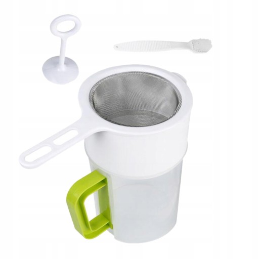 Jest to zestaw narzędzi filtrujących, wykonanych z najwyższej jakości tworzyw sztucznych i materiałów nylonowych. Zestaw kombinowany, może być używany do robienia mleka sojowego, soku owocowego, jogurtu i innych napojów. Dobra jakość wykonania, bardzo cienka siatka, dobra do użytku domowego.
