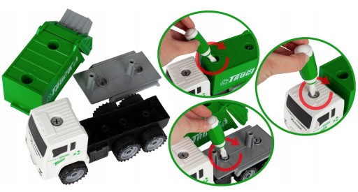 Zestaw zawiera śrubokręt z wymiennymi końcówkami, dzięki któremu dziecko może rozbierać i składać śmieciarkę według instrukcji na opakowaniu.