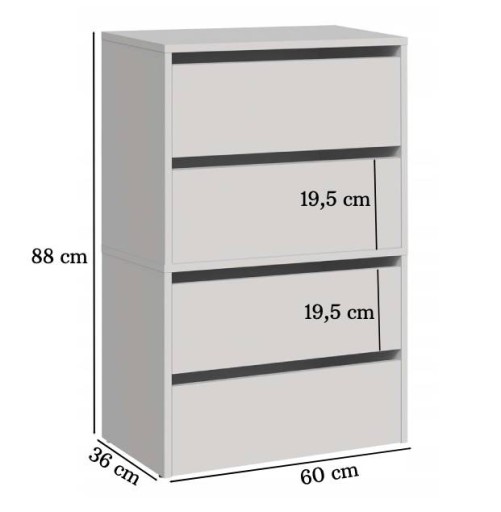 Szafka jest modułowa, co pozwala na dowolne rozbudowanie i dopasowanie do Twoich potrzeb. Pomieści od 8 do 12 par butów, a brak uchwytów dodaje jej nowoczesnego, minimalistycznego wyglądu.