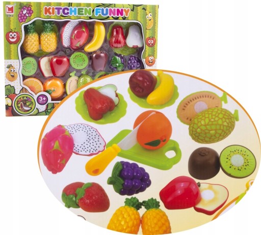 Zestaw składa się z 15 elementów, są to przeróżne warzywa i owoce Realne odwzorowanie oraz ich ciekawa kolorystyka, sprawiają, że dziecko z pewnością będzie chciało wszystkim przyrządzać swoje dania. Rzepy znajdujące się wewnątrz produktów umożliwiają wielokrotne łączenie się dwóch przekrojonych połówek w całość. Do zestawu dołączono nożyk, którym możemy przekrawać swoje produkty. W zestawie znajdziemy także deskę do krojenia. Każdy z produktów jest starannie i solidnie wykonany, z dbałością o każdy szczegół, każda połówka ma idealnie odwzorowany przekrój.