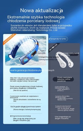 Wykorzystanie 360 stopni wokół całego obszaru wiatru, fizyczne chłodzenie porcelany lodowej, cicha redukcja szumów, jedna sekunda na schłodzenie 15 stopni, ultra-wysoki zasięg, długotrwałe noszenie nie męczy szyi, wydmuchiwanie lodu chłodnego lata