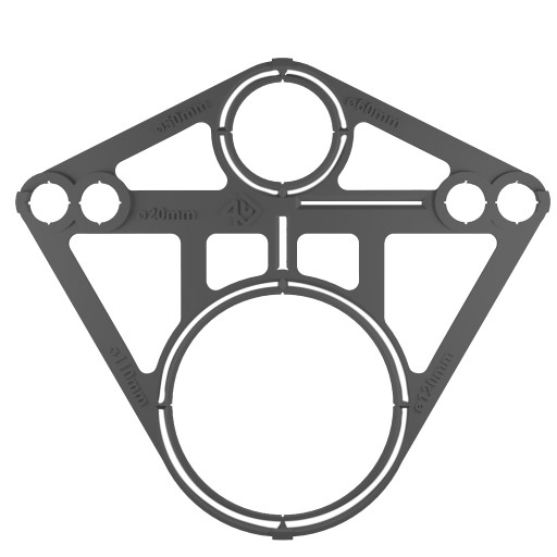 Ten specjalistyczny przymiar jest kompatybilny z dwoma rodzajami rozstawów szpilek: 180mm oraz 230mm. Co więcej, posiada otwory o średnicach 20mm, 50mm, 60mm, 110mm oraz 120mm, które są odpowiednio oznaczone, ułatwiając identyfikację. Dodatkowe znaczniki pionu i poziomu umożliwiają perfekcyjne ustawienie przymiaru.