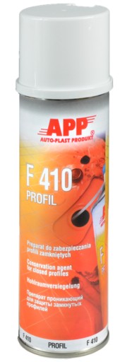 APP F410 Profil Spray jest antykorozyjnym, trwale elastycznym preparatem na bazie wosku i dodatków impregnacyjnych do zabezpieczania profili zamkniętych oraz trudno dostępnych miejsc karoserii samochodowych. Po odparowaniu rozpuszczalnika tworzy ciągłą elastyczną i lepką powłokę ochronną.