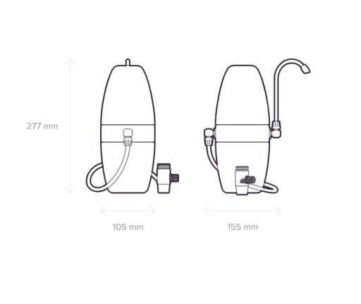 Filtr podłącza się na stałe do baterii (w miejsce perlatora kranowego) poprzez specjalny, dołączony do zestawu wężyk zakończony przełącznikiem strumienia wody.