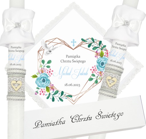 Prezentujemy niezwykły komplet szatki i świecy do chrztu, stworzony z myślą o uroczystym wydarzeniu w życiu każdego dziecka. Szatka wykonana jest z śnieżnobiałego materiału i obszyta bawełnianą koronką, co nadaje jej elegancji i delikatności. Świeca zdobiona jest ręcznie, a na niej umieszczony jest nadruk z imieniem dziecka, co sprawia, że jest to wyjątkowa i niepowtarzalna pamiątka. Świeca posiada srebrny sznurek, na jej powierzchni znajduje się szara jutowa wstążka wraz z koronką oraz drewniane serduszko,na którym znajduje się emblemat Ducha Świętego koloru srebrnego. Pozostała część świecy jest owinięta szyfonową białą wstążką. Wszystko to zapakowane jest w kartonowe białe pudełko z napisem "Pamiątka Chrztu Świętego", a do kompletu dodajemy jeszcze materiałową profitkę. Ten wyjątkowy zestaw szatki i świecy z pewnością podkreśli uroczystość chrztu i wzmocni emocje i wspomnienia związane z tą wyjątkową okazją.