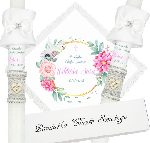 Prezentujemy niezwykły komplet szatki i świecy do chrztu, stworzony z myślą o uroczystym wydarzeniu w życiu każdego dziecka. Szatka wykonana jest z śnieżnobiałego materiału i obszyta bawełnianą koronką, co nadaje jej elegancji i delikatności. Świeca zdobiona jest ręcznie, a na niej umieszczony jest nadruk z imieniem dziecka, co sprawia, że jest to wyjątkowa i niepowtarzalna pamiątka. Świeca posiada srebrny sznurek, na jej powierzchni znajduje się szara jutowa wstążka wraz z koronką oraz drewniane serduszko,na którym znajduje się emblemat Ducha Świętego koloru srebrnego. Pozostała część świecy jest owinięta szyfonową białą wstążką. Wszystko to zapakowane jest w kartonowe białe pudełko z napisem "Pamiątka Chrztu Świętego", a do kompletu dodajemy jeszcze materiałową profitkę. Ten wyjątkowy zestaw szatki i świecy z pewnością podkreśli uroczystość chrztu i wzmocni emocje i wspomnienia związane z tą wyjątkową okazją.